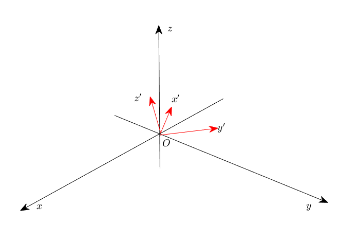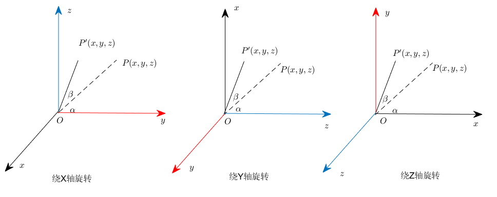 这个旋转保持$\mathrm{y}$坐标不变,同时在$XZ$平面上变换$\mathrm{x}$和$\mathrm{z}$坐标。而点$P$绕$\mathrm{x}$轴旋转角度$\gamma$的旋转矩阵为