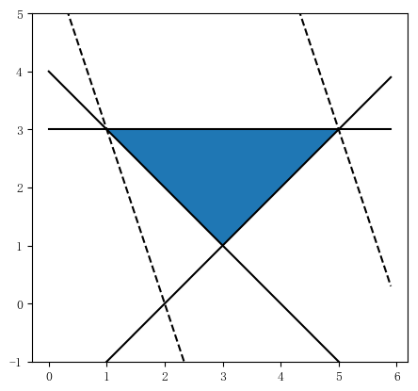 我想这个问题大家不会感到陌生了。答案很简单,选择C。血脉觉醒的高中生们会将不等式组中的不等式两两配对成三个二元一次方程组求解,得到三个点,最后把三个点分别代入$z=3x+y$最后得到最小值。这是比较快的方法,在90%的情况下这种策略是很奏效的。而学霸们也会采取画图的策略,平移直线来求解。这个问题的可行域如图2.1所示: