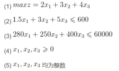 $$ \begin{align} \text{minimize}~&f = 3x{1} + 2x{2} - x{3}\[0.5em] \text{s.t.}~ & 3x{1} - x{2} + x{3} \leqslant 18\ & x{1} + 2x{2} \leqslant 16\ &x{1} + x{2} + x{3} \geqslant 2\ &x{1} + 2x{2} + 3x{3} = 15\ &x{1} - x{3} = 4\ & 0 \leqslant x_{i} \leqslant 16, ~i=1,2,3. \end{align} \tag{3.1.2}