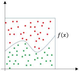 我想各位上中学的时候还没忘记蒲丰投针估计圆周率的故事吧,如果不幸忘记了,也还记得撒黄豆估计圆周率的方法吧。在一个正方形中画一个内切圆,往正方形内撒一大把黄豆,通过数出圆里面的黄豆和正方形里面的黄豆之比可以估计圆周率的近似值。这一原理也被广泛用于求函数的定积分。图2.3是一个利用Monte Carlo方法求定积分的例子,通过统计方形中点的个数和曲线下方点的个数之比,就可以近似模拟定积分与方形面积之比。