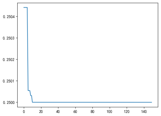 pso = PSO(func=demo_func, n_dim=3, pop=40, max_iter=150, lb=[0, -1, 0.5], ub=[1, 1, 1], w=0.8, c1=0.5, c2=0.5)